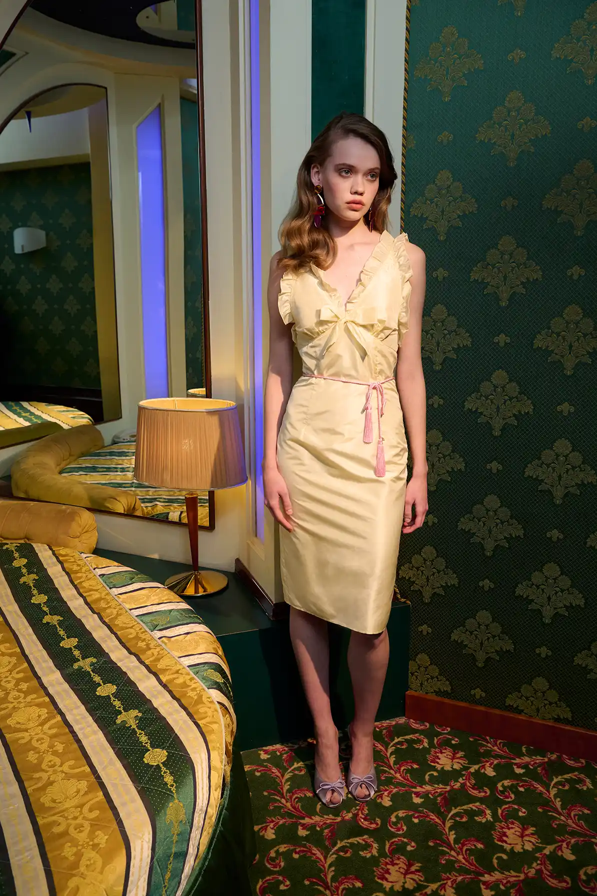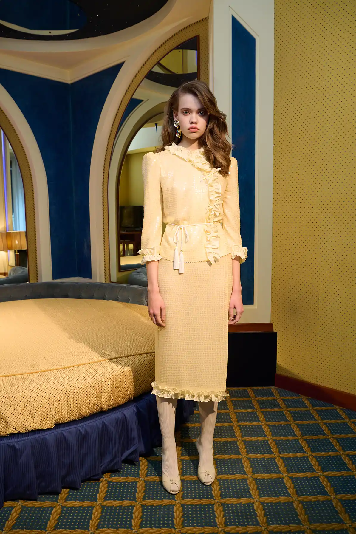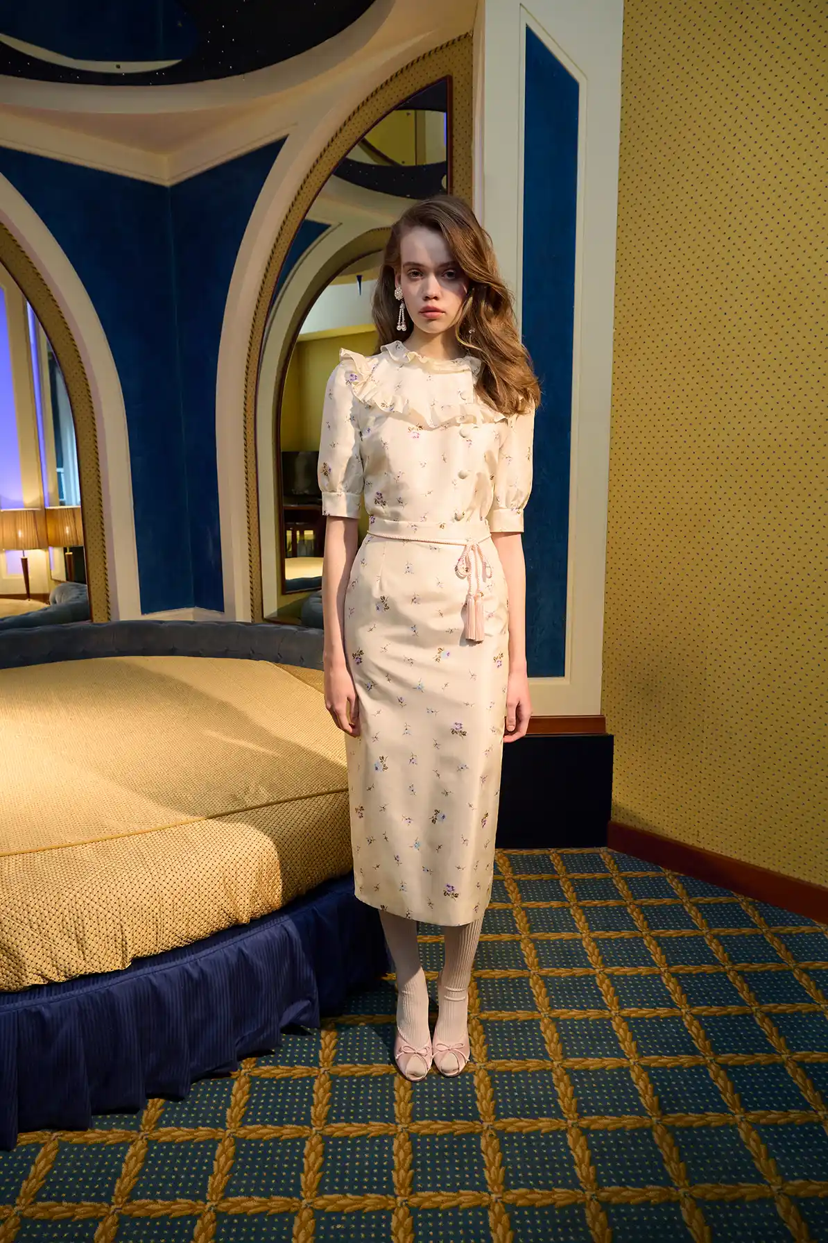 The collection unfolds like that exercise in self-invention. Signature tea dresses appear first — flounced, floral, lace-trimmed — in butter yellow, faded pastels, and saturated violet. There is an echo of Judy Garland’s fragile glamour in their heightened femininity, sweetness sharpened by experience. Lace and tweed iterations are punctuated with bows climbing the thigh or fastening front flaps, gently unsettling their ladylike codes. Tassel-trimmed belts, reminiscent of antique upholstery, cinch the waist with deliberate excess. The mood shifts from afternoon propriety to something more nocturnal and introspective.