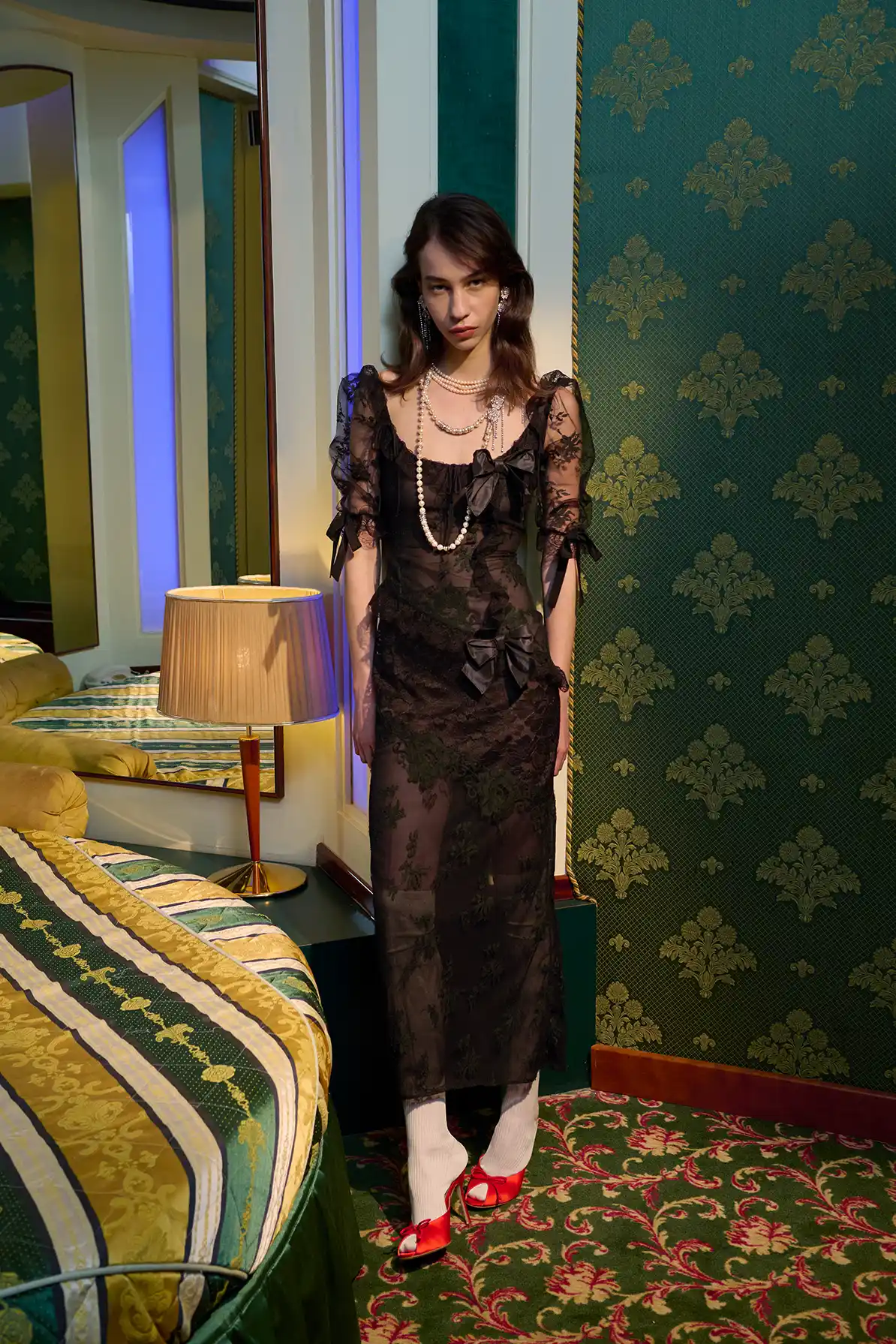 Then comes the counterpoint. A slouchy nylon jacket cuts cleanly through the lace and florals, introducing a faint abrasion. Accessories heighten the tension: bright red mules paired with ribbed, over-the-knee silk stockings; vintage-style jewellery with a pronounced ’80s inflection. The effect is knowingly theatrical, but never ironic.