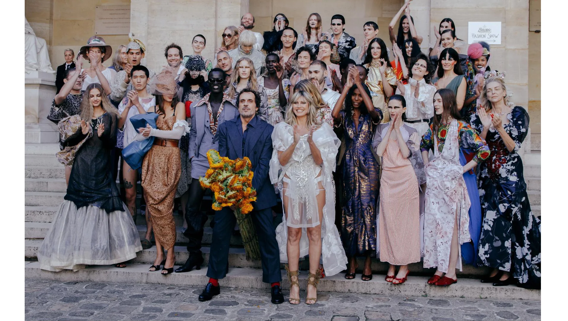 The collection started with looking at designs of old curtain drapes, translating them into things you can wear. I fell in love with these typical Italian fabrics that you would find in markets everywhere, we combined them with iconic prints of the house, reusing leftover fabrics. I live in Milan and spent time on a Sicilian island this summer - more than anything I wanted to capture the spirit of the Mediterranean. What was most important is that everything looks easy and lived in, worn, simple to care for - neither old, nor new - real clothes that belong to the people that wear them. I used skins of lace punched leather, embroideries left in drawers - nothing went to waste. It's wonderful to show in L'Institute de France, a cultural and historical place of enormous importance. The Ikebana in the room is comprised of sunflowers and one umbrella from Cherbourg. There are lots of sunflowers on our studio terrace in London and every time I look at them they make me smile. We are living in a world of great change; therefore, I've chosen the last movement of Jupiter by Mozart as the music. It's a sound that foresees the future in the most hopeful way. Andreas Kronthaler
