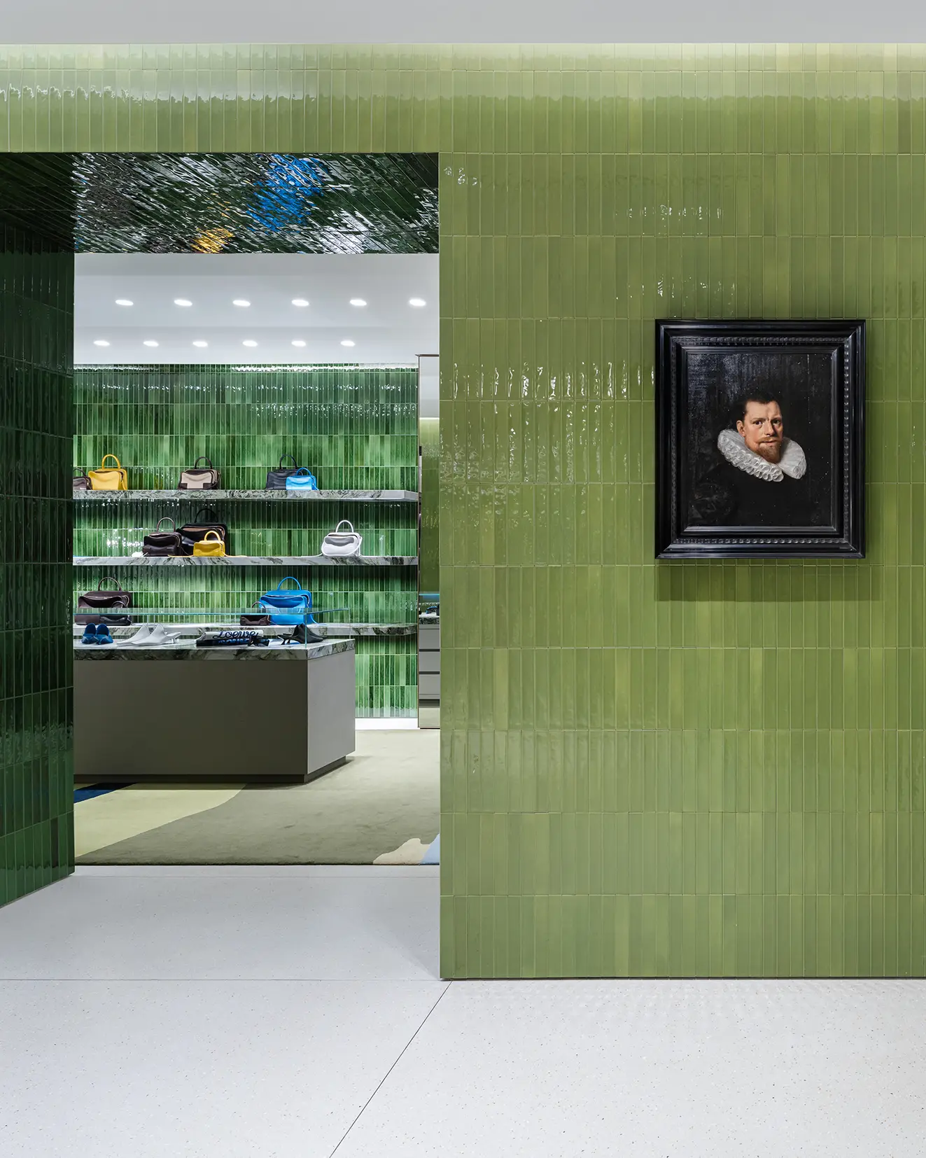 Art is woven seamlessly into the space, drawn entirely from the LOEWE art collection. Contemporary works by Mary Stephenson, Jordan Belson and Ian Felice are placed in dialogue with 17th-century portraiture from the Dutch and Anglo-Flemish schools. Rather than opposing past and present, the encounter creates correspondences — between material and image, stillness and movement, intimacy and monument. Etchings by Paul Thek appear throughout, adding moments of vulnerability and quiet intensity.