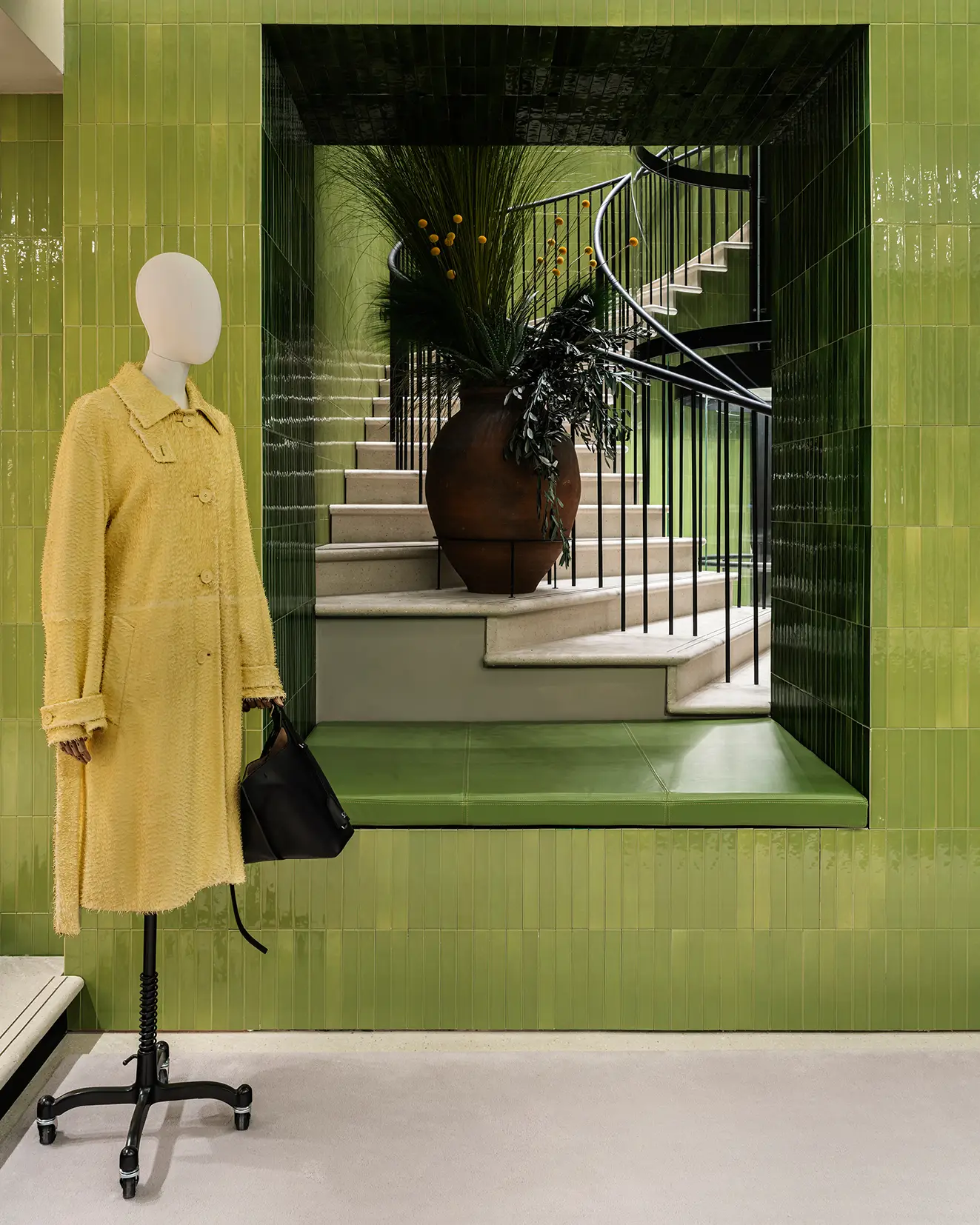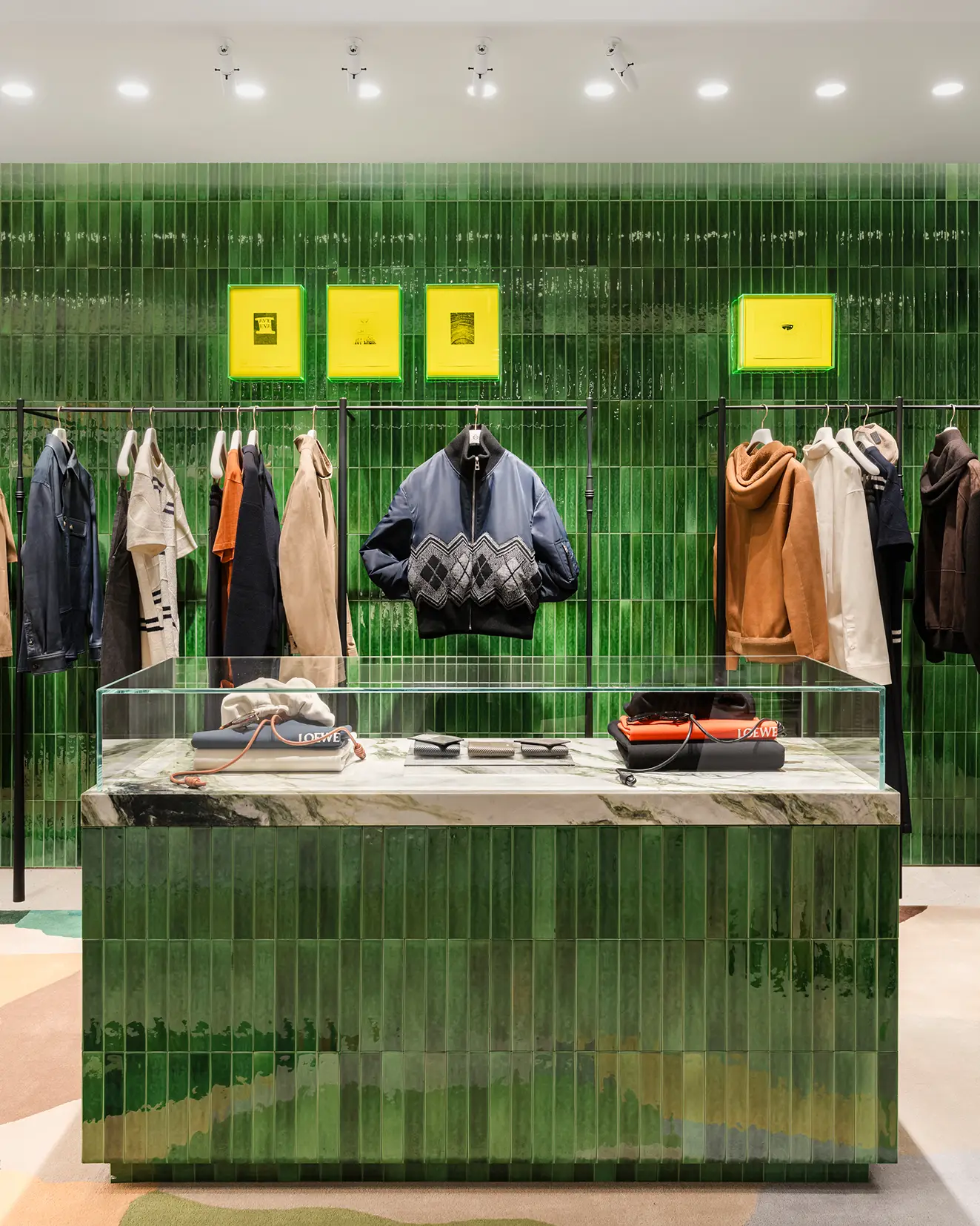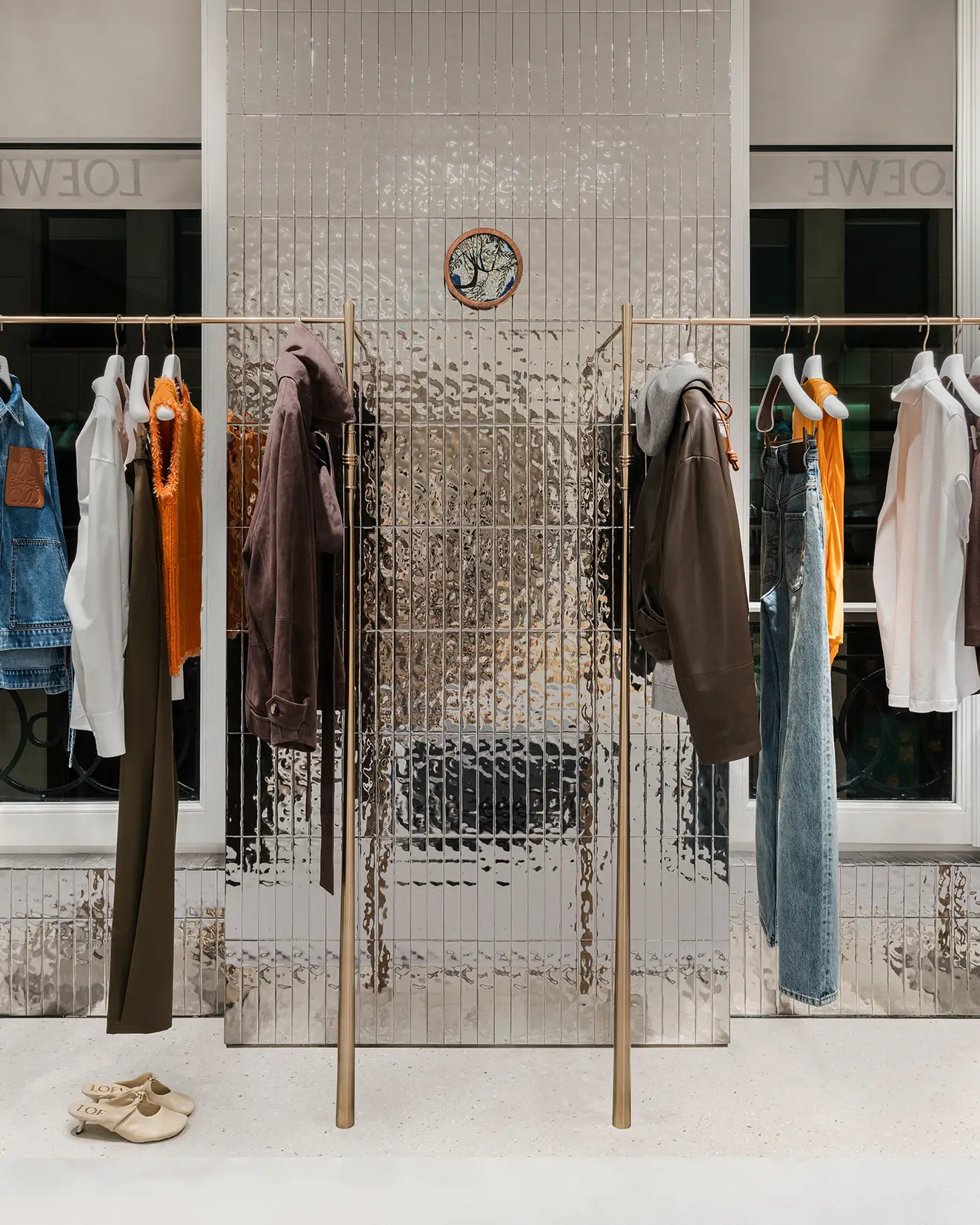Spanning 405 sqm, CASA LOEWE St. Honoré presents a curated selection of women’s and men’s collections where materials, textures and objects lead the way. Concrete, hand-glazed ceramics, brass and marble create a tactile landscape. Texture is everywhere — underfoot, along the walls, in the way light settles on surfaces — celebrating LOEWE’s commitment to art and craft.