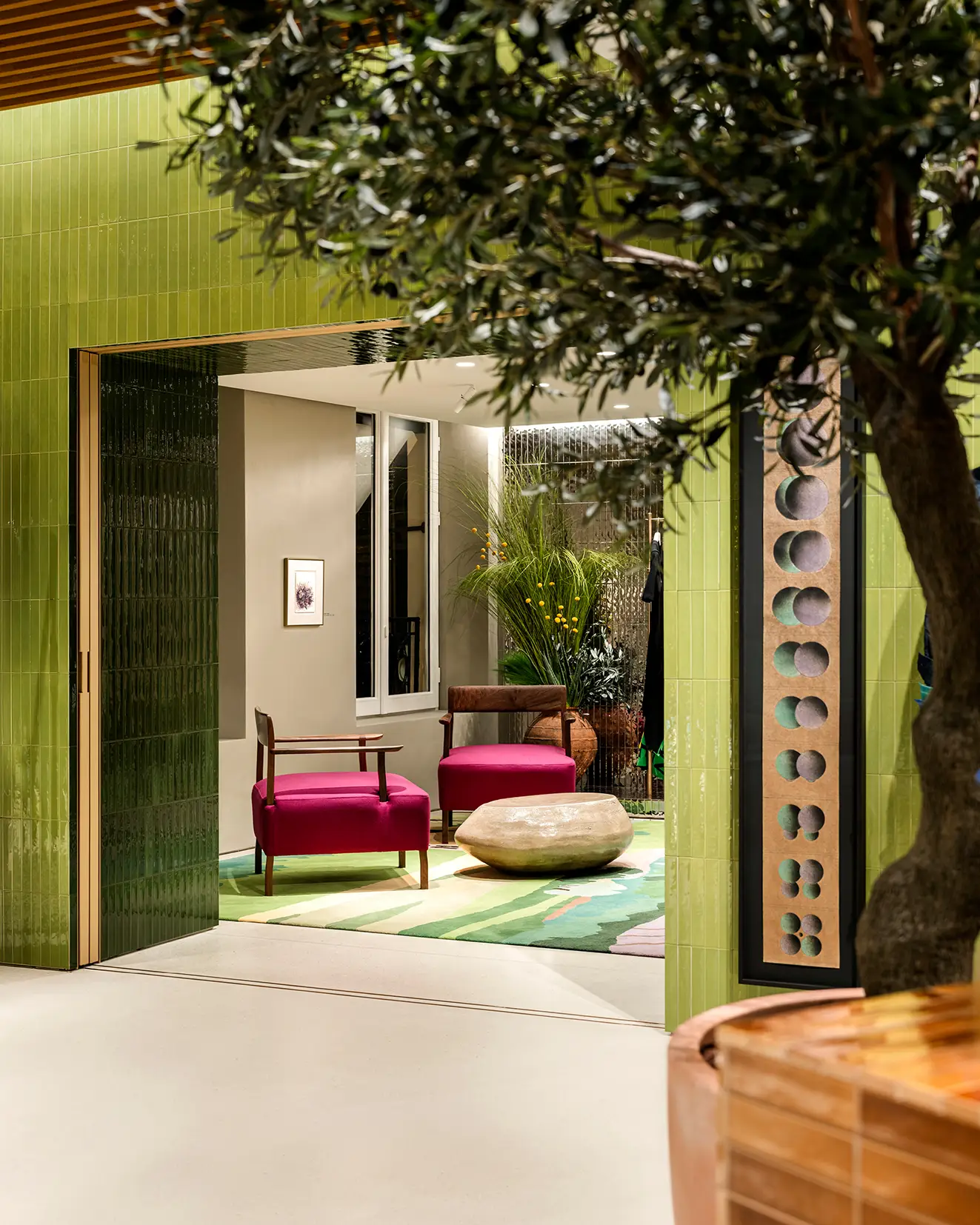 Design continues this spirit of cultural and artistic exchange. Iconic pieces by Gerrit Thomas Rietveld and George Nakashima sit alongside LOEWE’s in-house creations. Custom rugs, based on designs by British textile artist John Allen and produced as artisan wool carpets in Spain, introduce colour and abstraction, anchoring the environment in a richly textured universe.