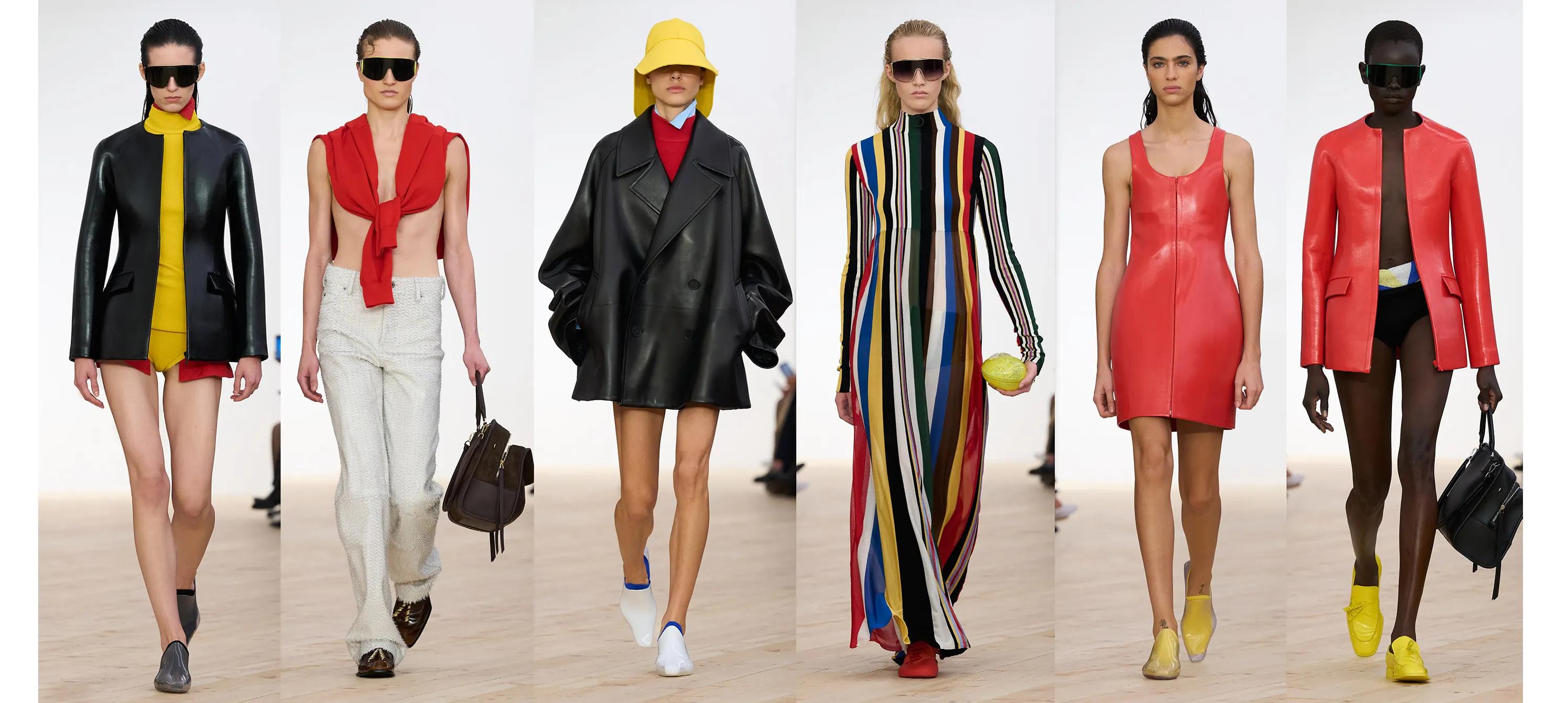 The collection employs a visual language of reduced, sometimes sculptural forms and elemental colour, drawn from sportswear archetypes and often expressed through the medium of leather craft. These forms are animated by a sensuality and fervour that re-articulates LOEWE’s heritage.