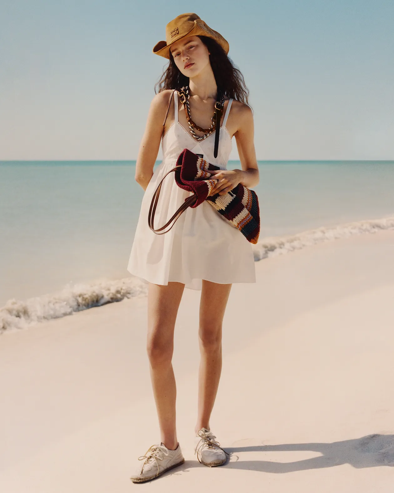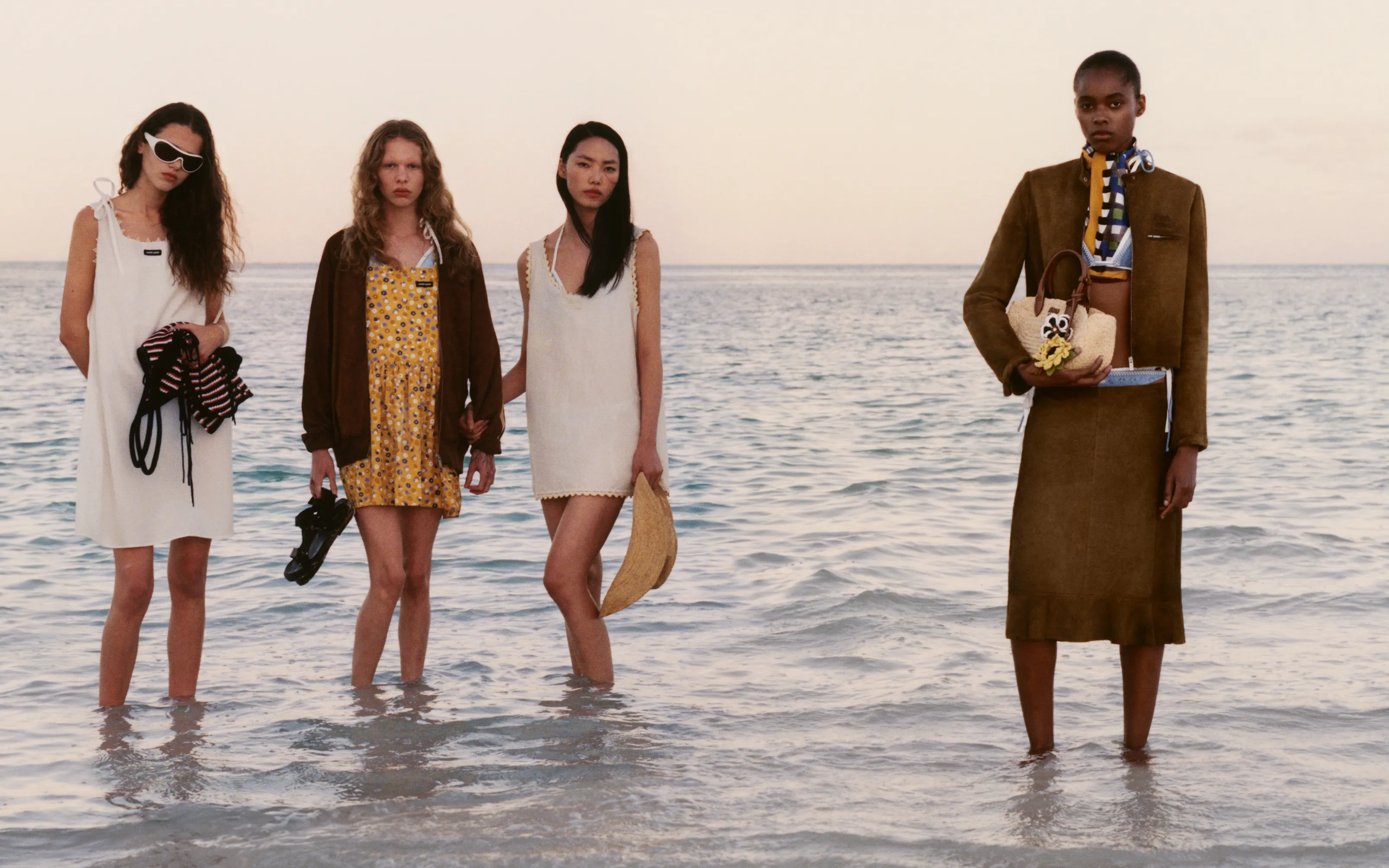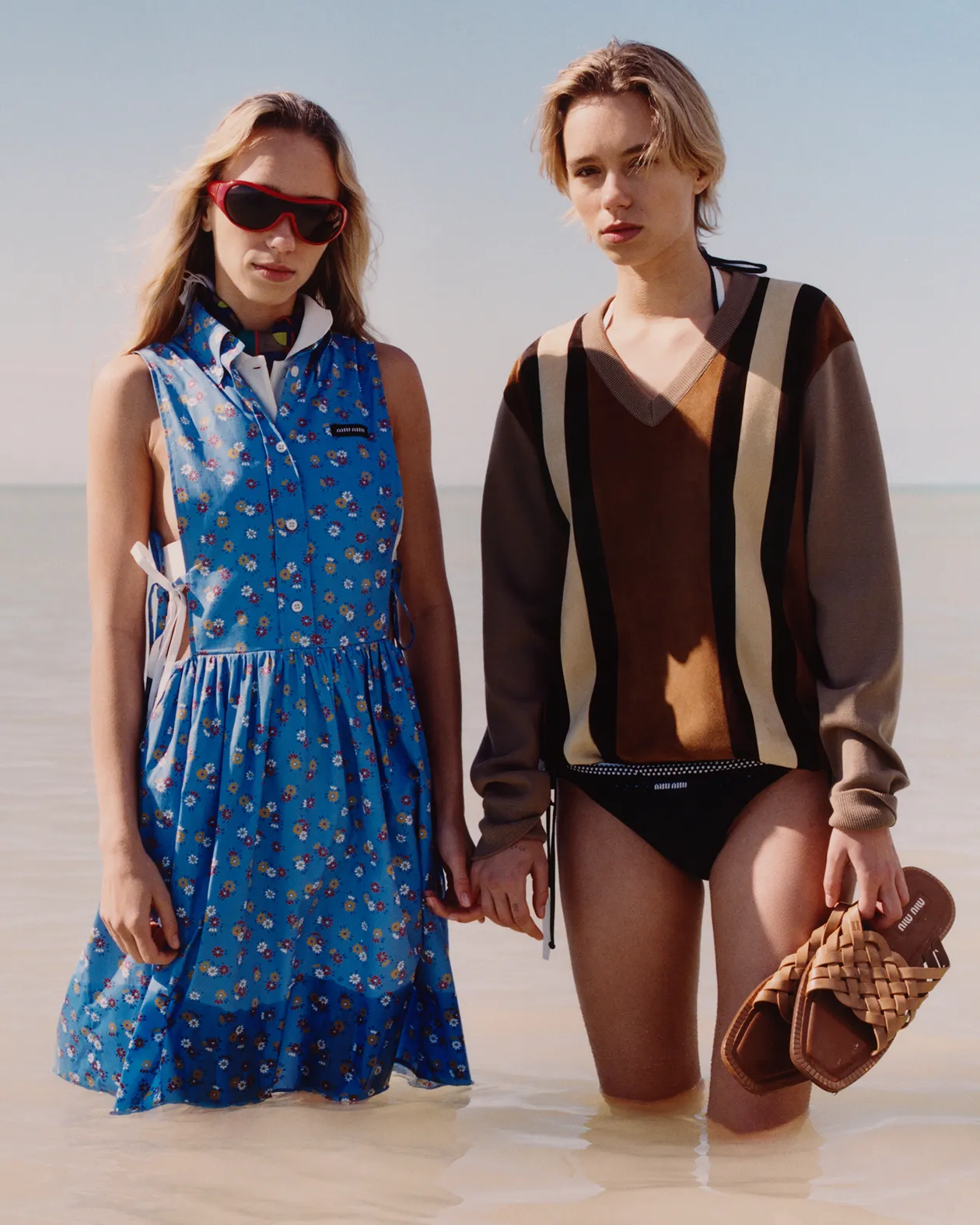 Sunshine and the colour blue permeate water, sky and horizon, softening edges, until distinctions dissolve - The Miu Miu 2026 l’Eté collection and campaign, photographed by Jeano Edwards, and worn by Sateen Besson, Liu Haocun, Lena Mantler and Lisa Mantler, is an exploration of diurnal light, as long, lazy, summer days become one, in an endless seascape filled with gentle optimism and hope for the future.