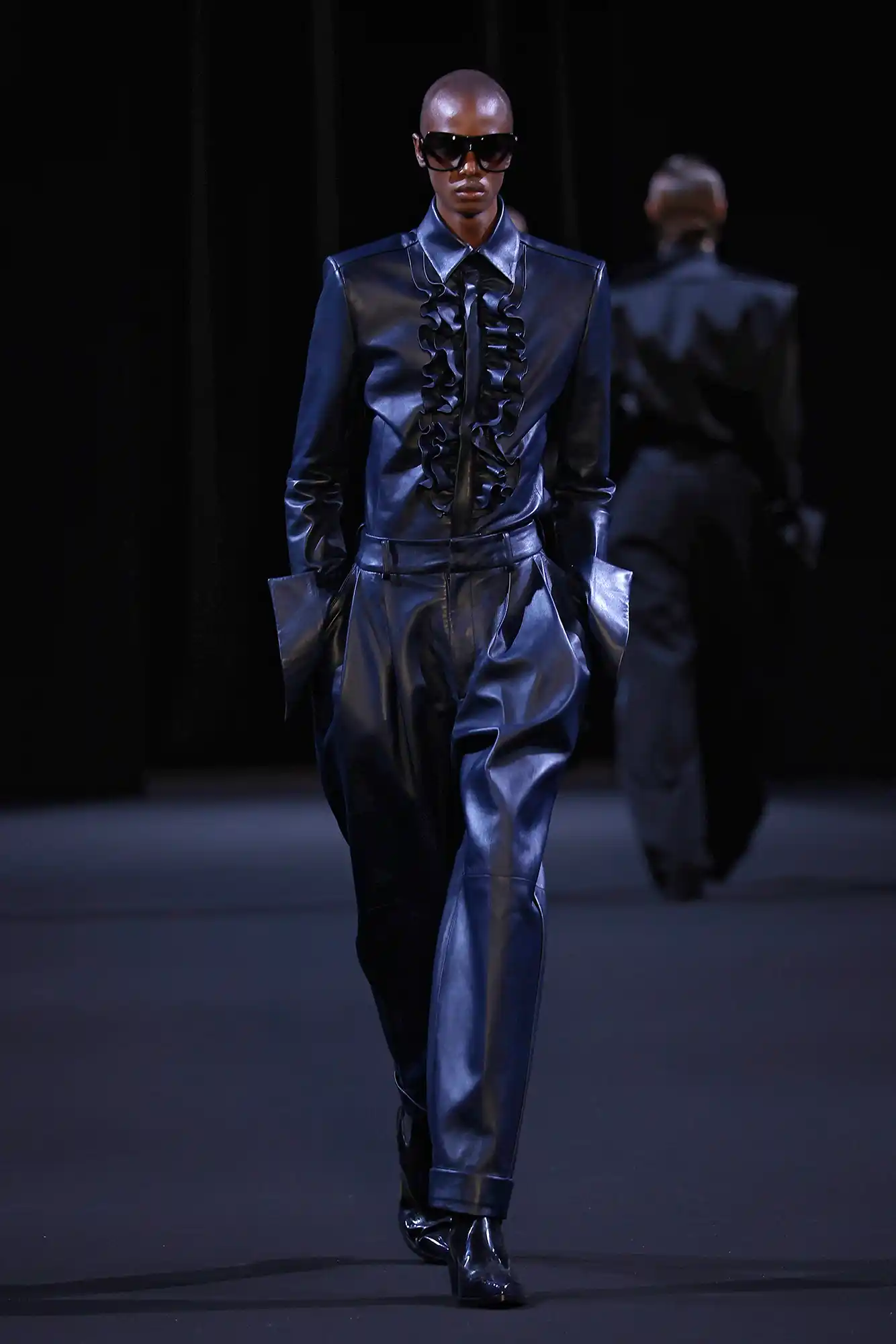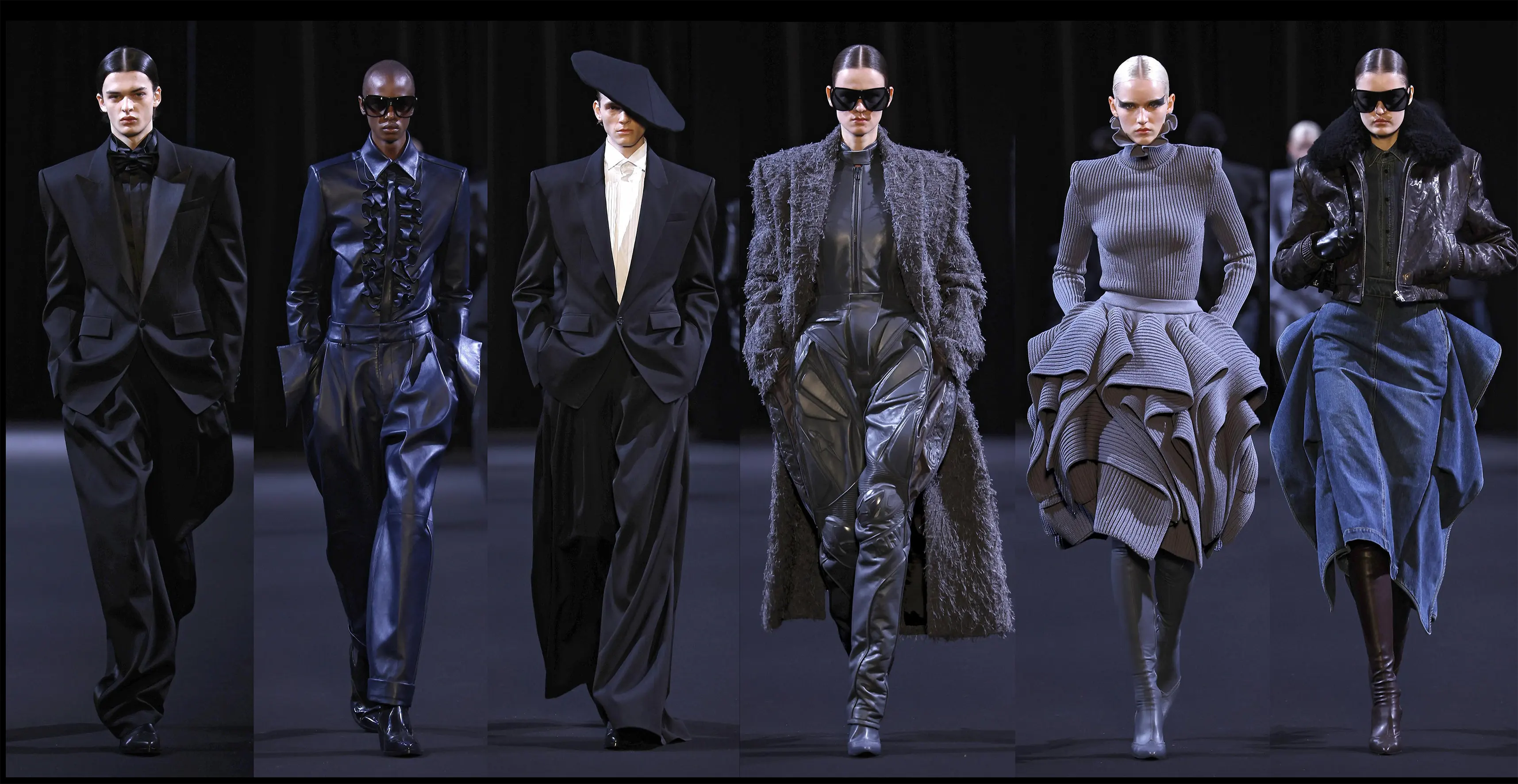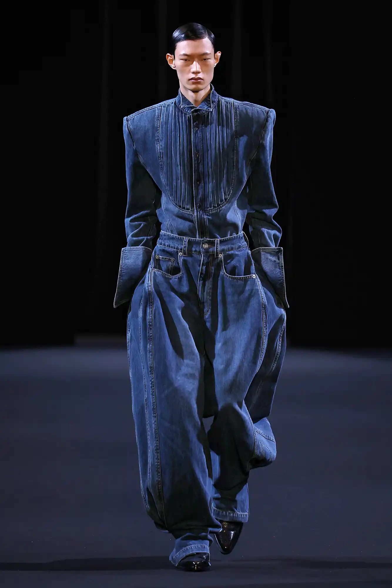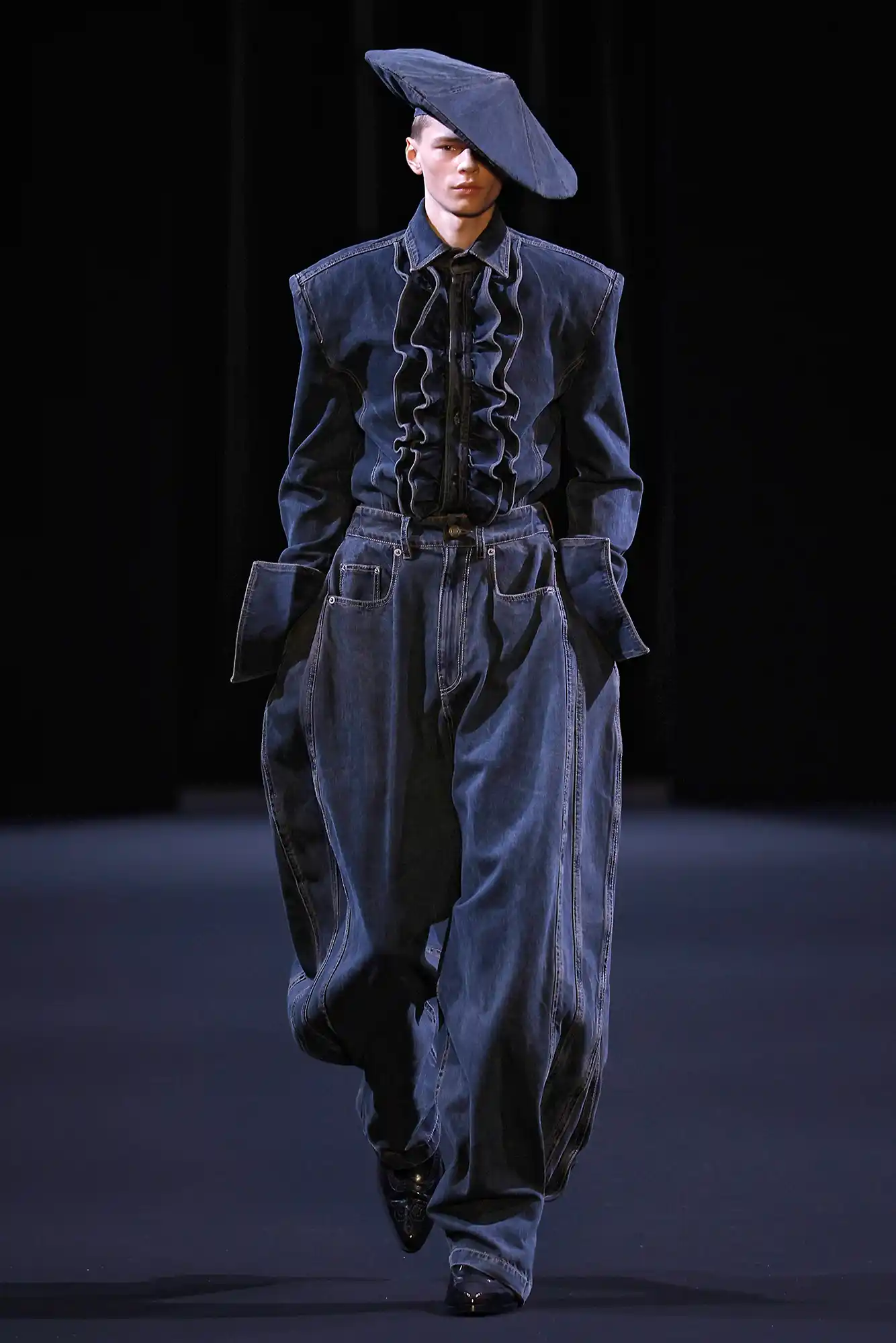 JUUN.J reshapes classic eveningwear through an unexpected dialogue between tailoring and street materials—pairing broad-shouldered tuxedo blazers in denim with leather ruffles that recast formal elegance as sharp, modern, and unapologetically bold.