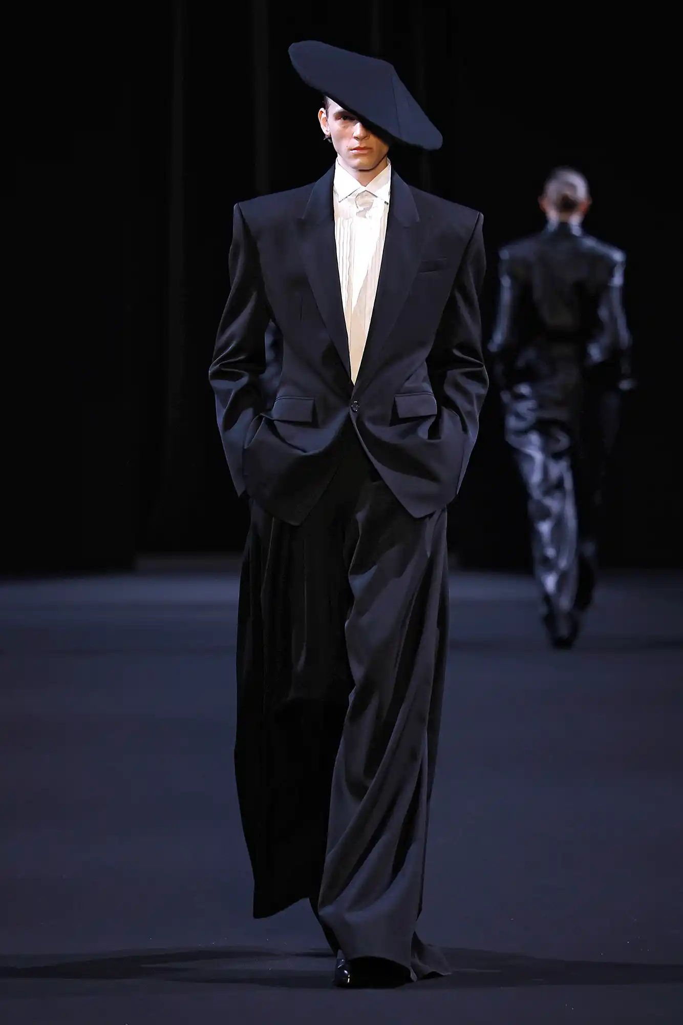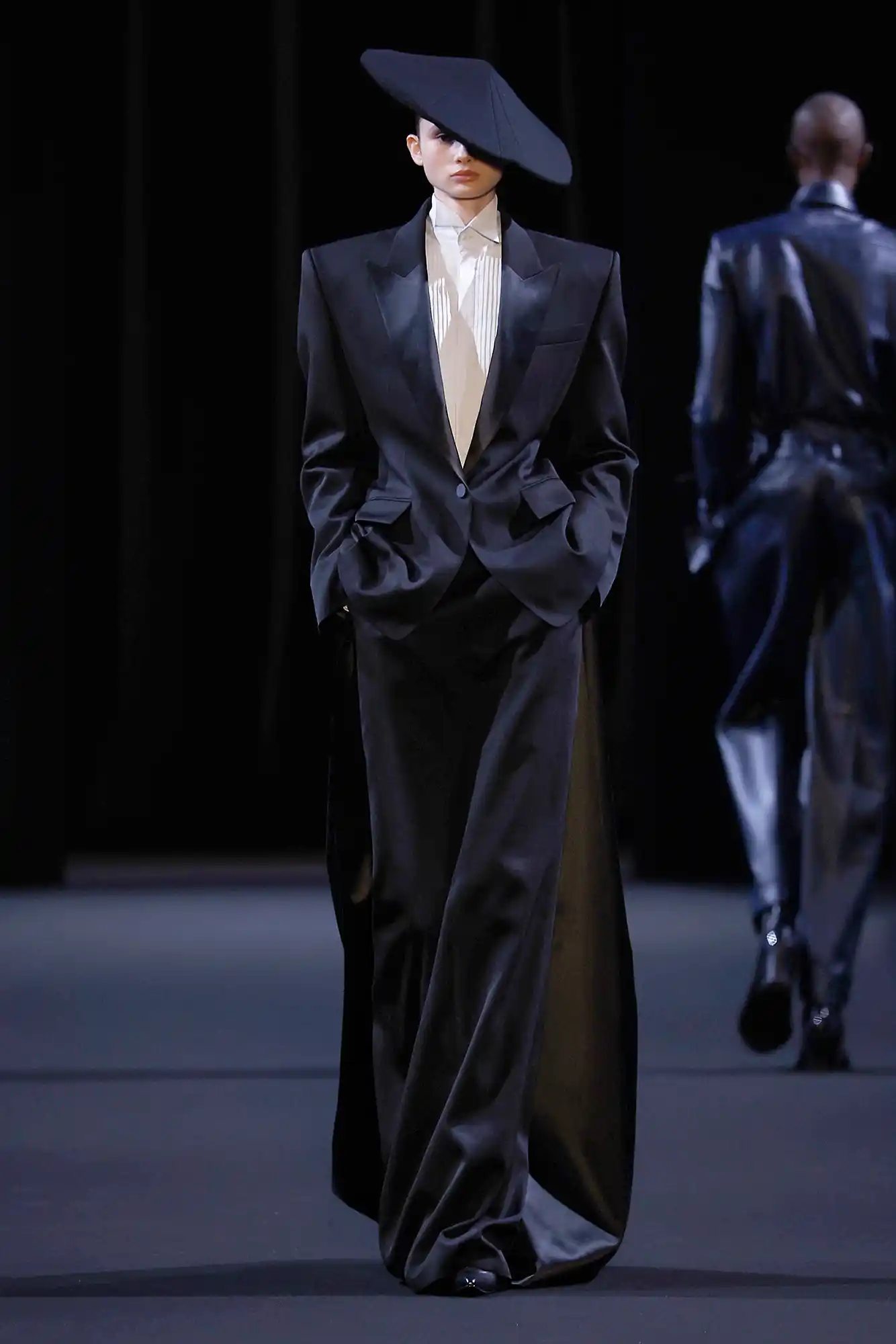 The show opened with a series of sharp black tuxedo silhouettes, setting a restrained and elegant tone, before transitioning into more expressive looks. The finale featured bold biker ensembles created in collaboration with Italian motorsports brand Alpinestars RSRV, bringing a dynamic, high-performance edge to the collection. The theme “NEWSTALGIA” explores the coexistence of past, present, and future through refined tailoring and motorsport-infused silhouettes