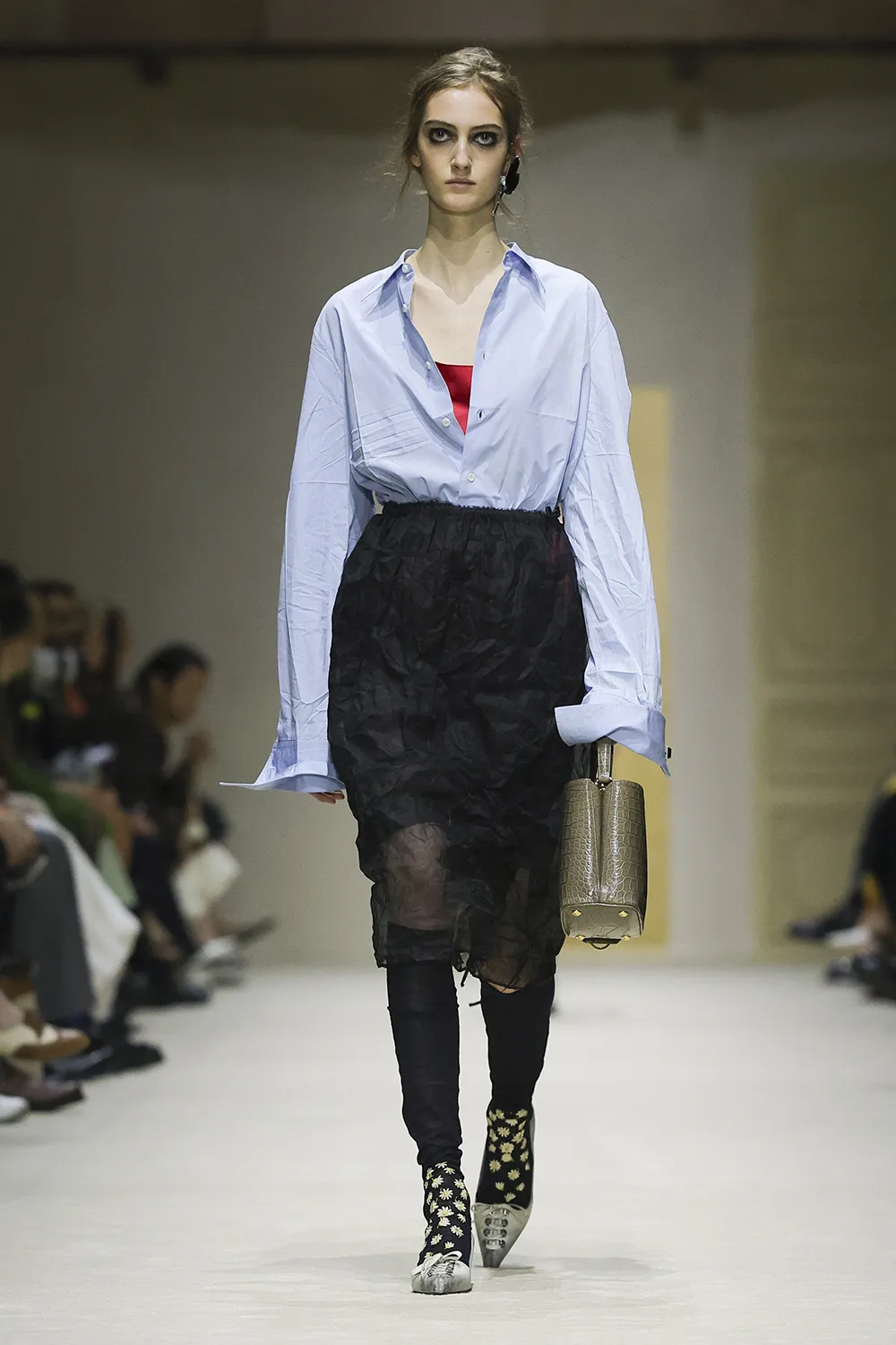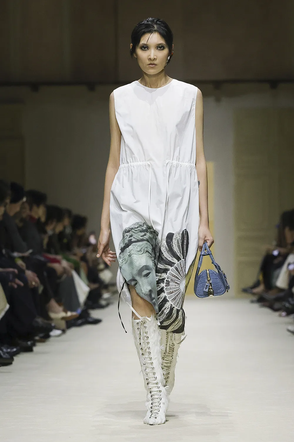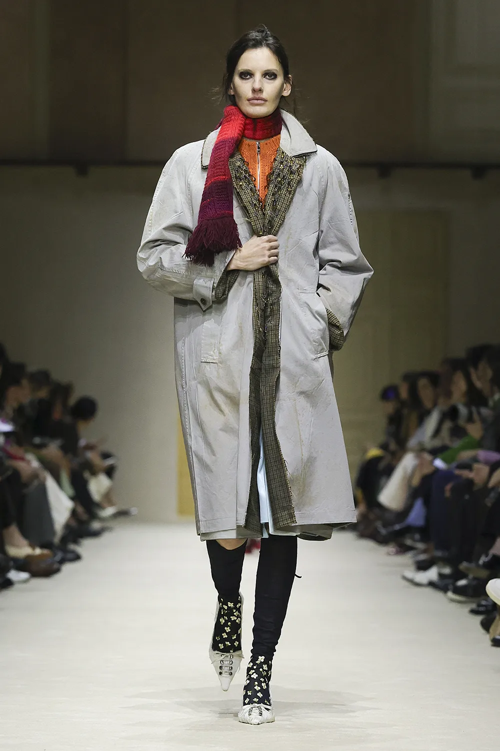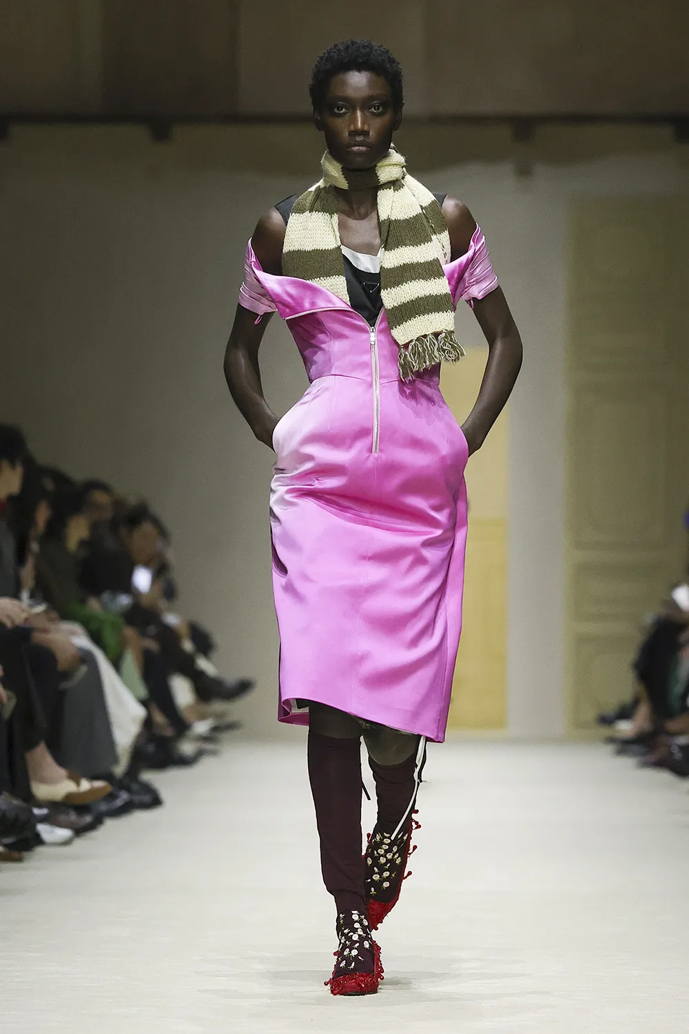 The show took place in the Deposito of the Fondazione Prada is populated by original artworks, significant furniture and objects: tapestry and a painting from the 16th and 17th centuries, an 18th-century Venetian mirror and consoles; chairs, lamps, and paintings from the 1900s. These artefacts span five centuries, divergent cultures, different places. Like the clothes, their meaning is layered, inherently personal, intimate, and filled with ceaseless possibilities.