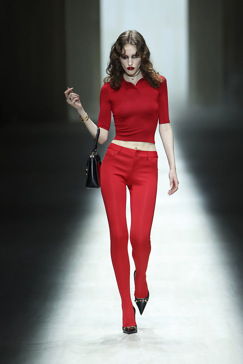 This collection establishes a new vocabulary of silhouettes, textures, and materials, expressing the product design ethos at the core of Gucci. It informs ideas of lightness, ease, comfort, and body-aware silhouettes, driven by rigorous product evelopment that has allowed us to create the ultimate seamless garments and pieces cut as close as possible to the body, a quintessentially Gucci sensibility, alongside invisible heat-sealed edges and engineered curved hems.