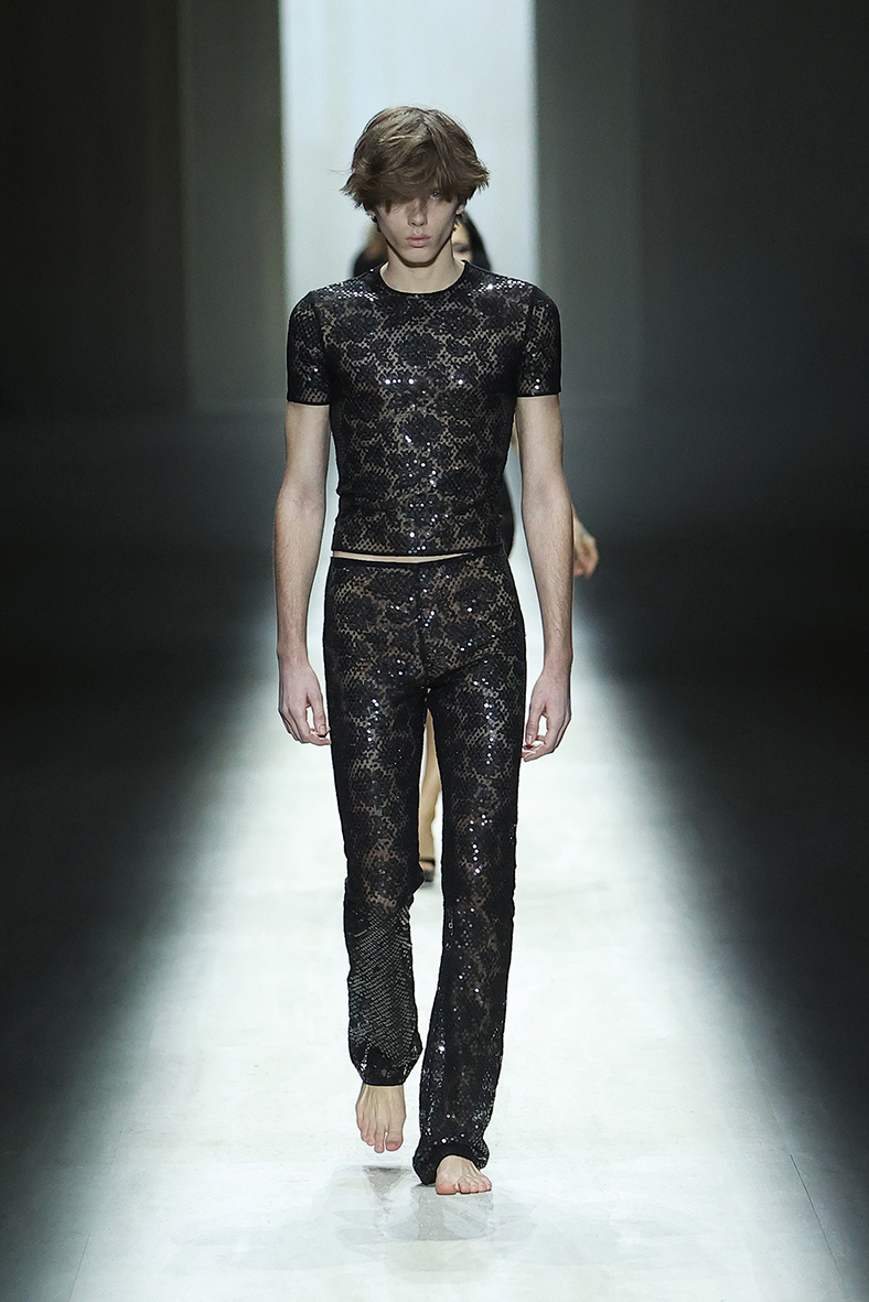 New garment types, an everlasting obsession of mine, include tracksuits and dresses morphed into modern trackdresses; leggings fused with trousers; jackets and tops merged into a single ultra-fitted garment; and leather shoes and sneakers that meld into a shoe with the aerodynamism of a sports car. Voluminous feather embroideries line snug bubble blousons, bombers, and intarsia shearlings, spilling out to frame the wearer’s face. Precious leathers, selected for their softness and pliability, lend ease to bikers, fitted pants, and plush circular stoles. The statuary that shaped my aesthetic sensibilities informs chiseled Adonis looks that speak to Renaissance ideals of proportionality and physique, skater looks worn with fluid T-shirts held in a Grecian drape, and a slinky white gown that evokes the Birth of Venus. Precious two-piece sets, a partyboy proposition of fitted tops and slinky trousers, are drowned in embellishment and worn barefoot, complementing risqué gowns and minidresses with waist-high slits, finishing with a backless gown that exposes a white gold GG thong bedazzled with 10-carats of diamonds. The iconic Gucci Bamboo 1947 bag is updated with a new, sleeker volume and a “bamboo” handle made of flexible, pieced leather sections, and archival minaudières are stretched to fit your phone + the essentials. Manhattan, my first Gucci sneaker, combines an ultra-minimal basketball shape with the slip-on ease of a mocassino, while soft Giovanni and Cupertino loafers erase the stiffness of leather shoes.