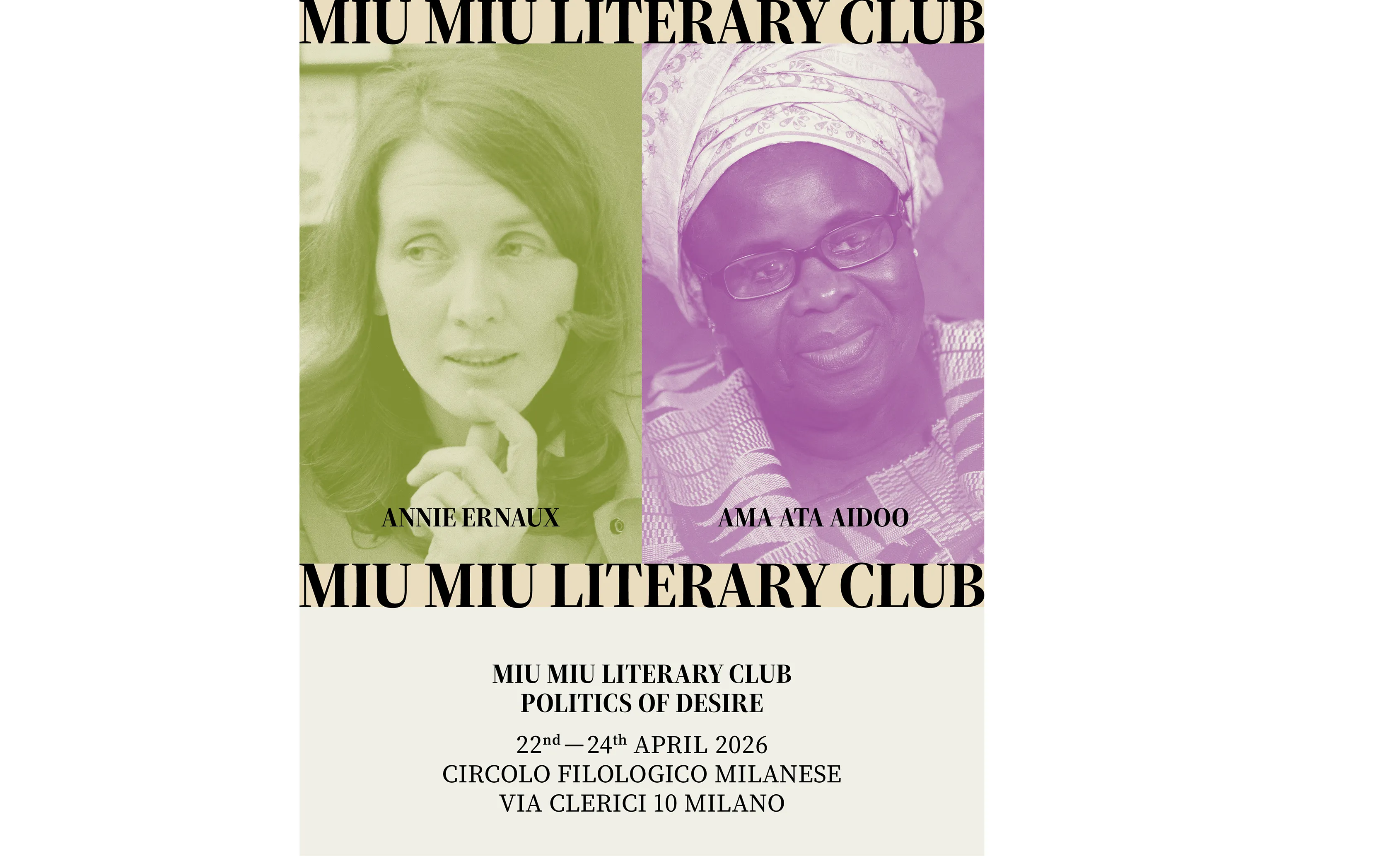 As always, the work of two highly revered and distinctive authors is the starting point from which to broaden any debate. This year, they are Nobel prize-winning, French-born Annie Ernaux with A Girl’s Story (2016), and one of the most authoritative figures in African literature and an icon of post-colonial feminist thought, Ama Ata Aidoo with Changes: A Love Story (1991). Taking place over three days, Miu Miu Literary Club takes inspiration from Europe’s rich heritage of literary salons and is located at Circolo Filologico Milanese in Milan. In addition to the panel conversations, for the first time this year, two lectures will be introduced as a moment of intellectual exploration, inviting participants to reflect on how literature can serve as a medium to deconstruct roles and identities.