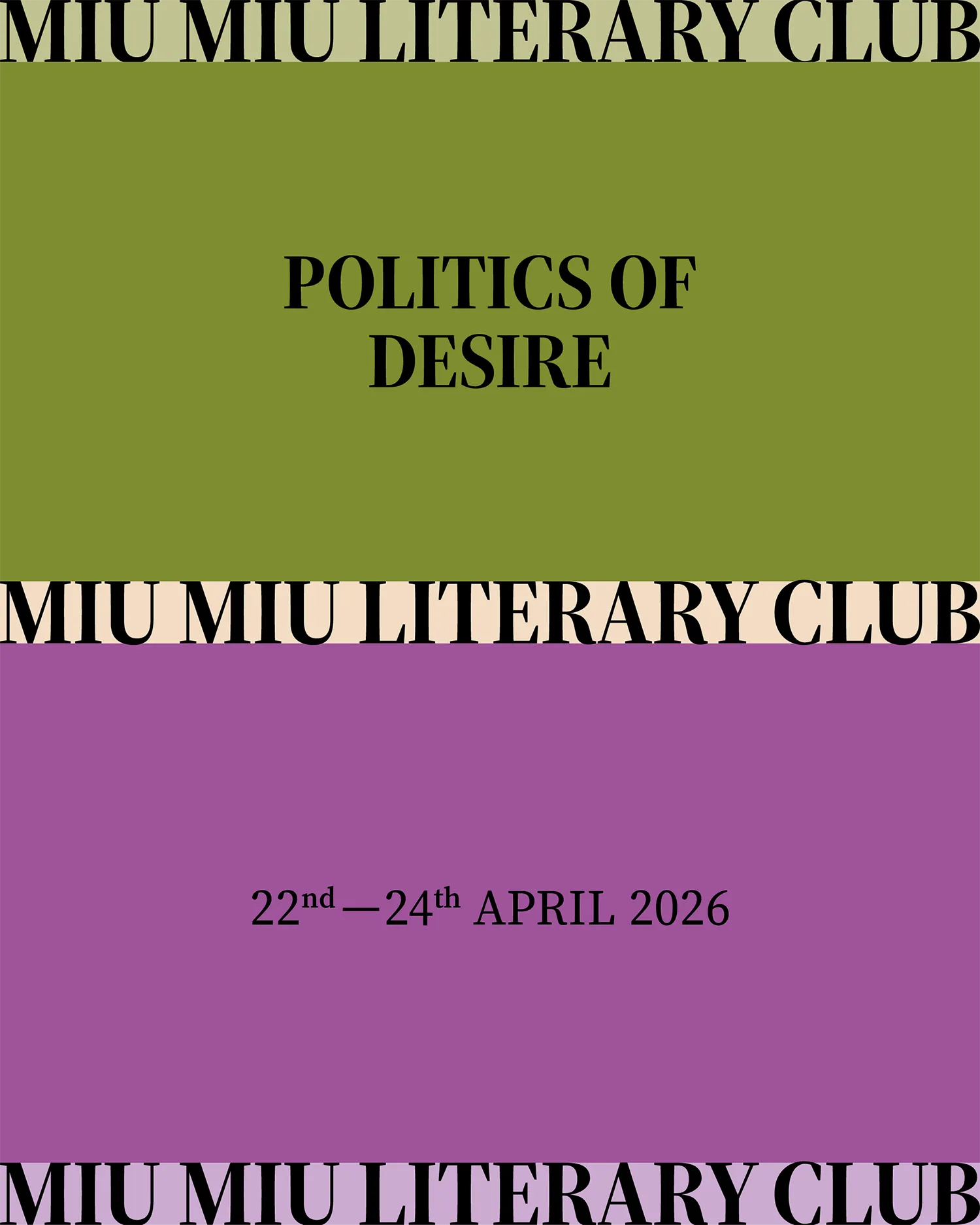 Miu Miu presents Literary Club 2026, “Politics of Desire”, under the direction of Miuccia Prada. Now in its fourth iteration (Milan 2026, 2025, 2024 - Shanghai 2025), this year’s event continues the aim to strengthen Miu Miu’s dialogue with contemporary culture, fostering a discourse on sexuality, desire and consent. From the personal to the political, and from literature to life, desire is a force that determines the right to exercise self-determination - a radical act of resistance.